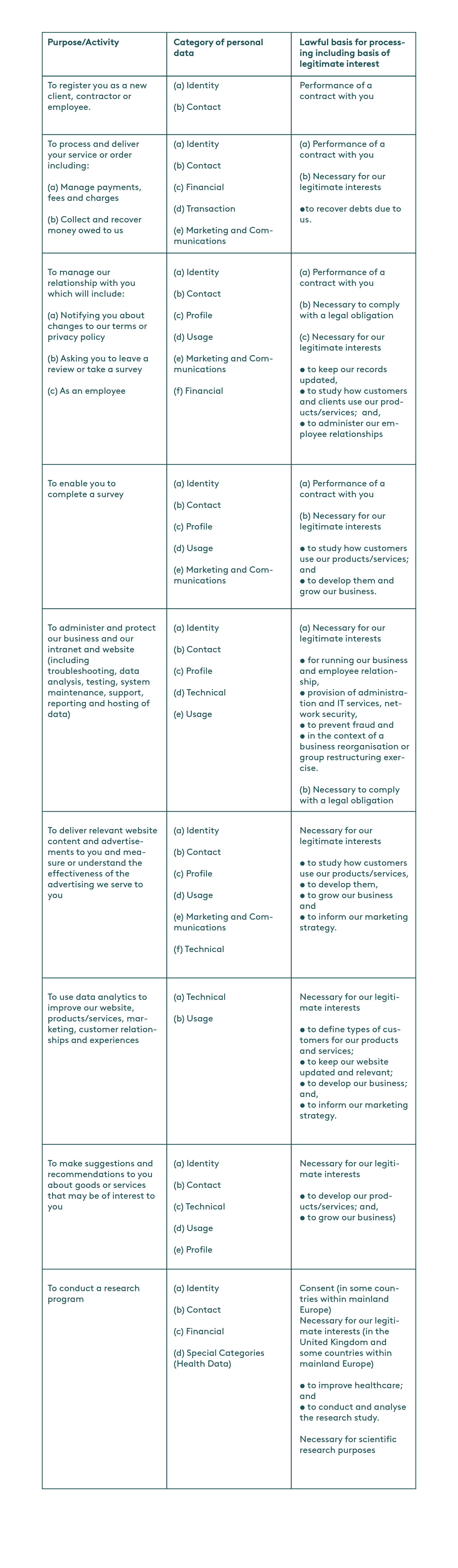 Note that we may process your personal data for more than one lawful ground depending on the specific purpose for which we are using your data. Please contact us if you need additional details about the specific legal ground that we are relying on to process your personal data where more than one ground has been set out in the table below.